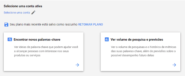 Caso você deseje apenas descobrir as métricas das palavras que já foram mapeados, escolha a opção “Ver volume” de pesquisa e previsões. Porém, se quiser, além de encontrar informações sobre as palavras anotadas, também ter acesso a outras palavras semelhantes, escolha a primeira opção “Encontrar novas palavras-chave”.