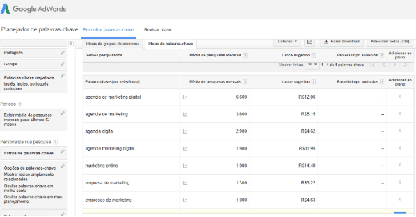 A função dessas ferramentas é não apenas encontrar as informações das palavras, como também sugerir outras ideias e aumentar a nossa lista. Como trabalhamos com o buscador do google, indicamos o Planejador de palavras-chave. É uma ferramenta gratuita do Google, porém também existem outros como Ubersuggest.
